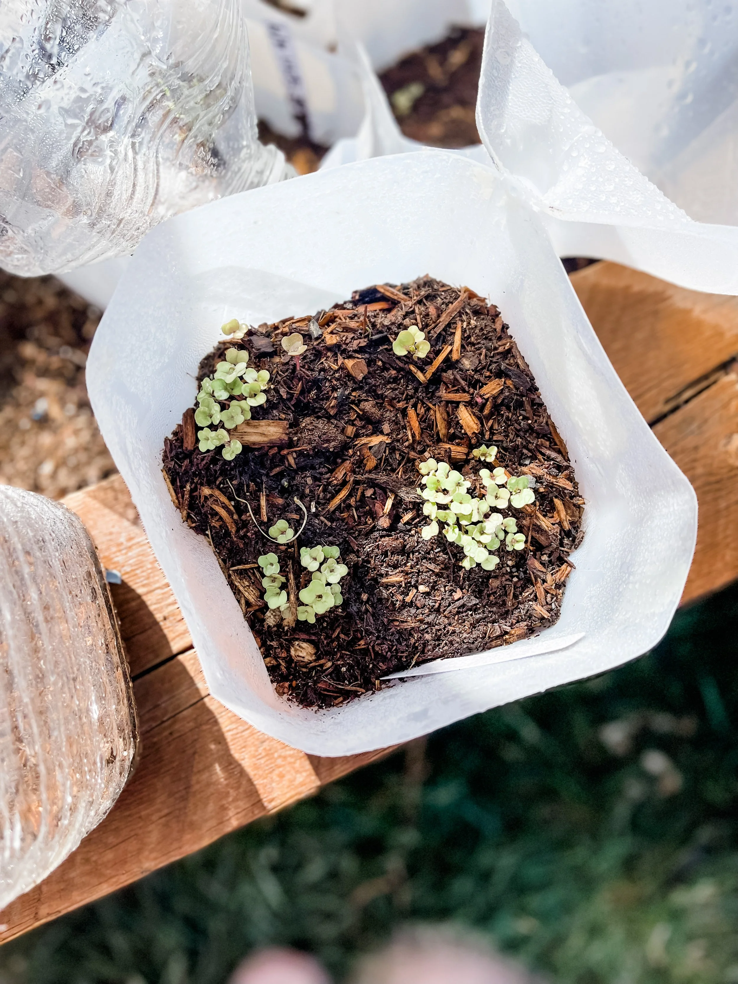 I still used the opaque and clear gallon containers, but I also used a few fruit containers, the rectangular ones that you get strawberries in at Costco specifically. I actually liked using these the best. They had really good drainage already built in and were clear and easy to see through. I’m already saving those type of container for next year.